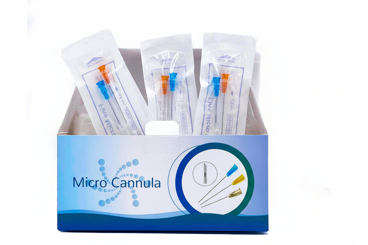 Our micro cannula, also known as micro-cannula, are an excellent way to inject dermal fillers and PRP. They ensure that the filler is injected into the deeper layers of the skin while using one insertion point. These disposable micro cannulas have a blunt, flexible tip. This reduces the risk of bruising and swelling, making the procedure more comfortable for your patient. Each box comes with 25.